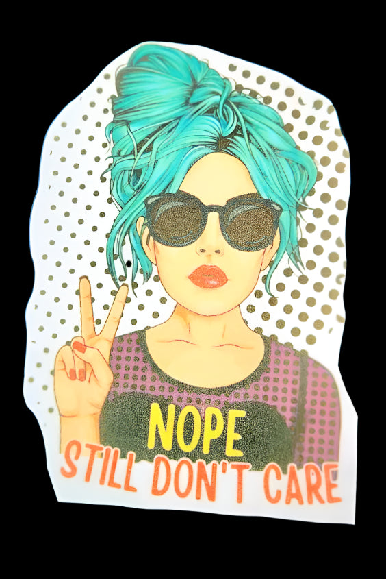 Express your unique style with this custom black tank top. Featuring a vibrant graphic of a girl with punk teal hair and sunglasses, it boldly states 'Nope, Still Don't Care' in striking colors. Perfect for casual wear or making a statement, this medium-sized tank top combines comfort with a bold attitude. The sleeveless design is versatile for any season