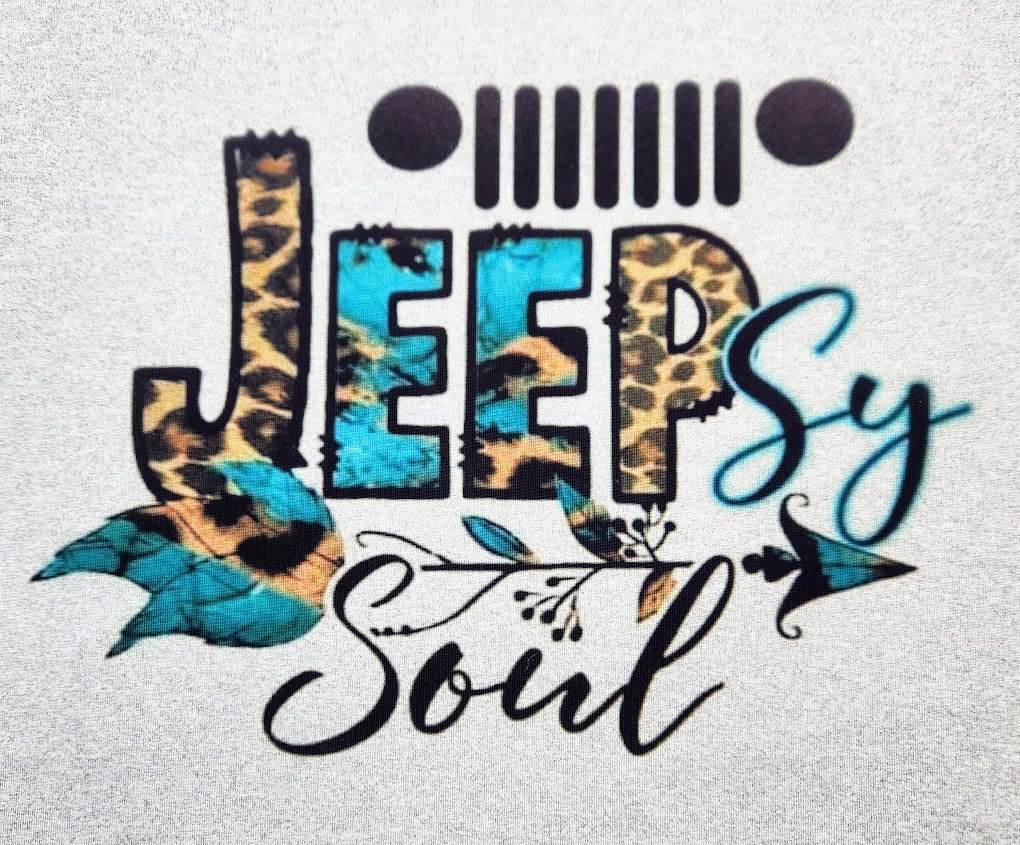 This medium grey tank top features a bold 'JeepSy Soul' graphic with striking animal print lettering, perfect for showcasing your adventurous spirit. The eye-catching design combines leopard and teal elements, creating a vibrant contrast against the soft grey backdrop. Ideal for casual outings or pairing with your favorite jeans, this tank top offers a comfortable fit and unique style. The sleeveless cut is perfect for warm weather, making it a versatile addition to your wardrobe.