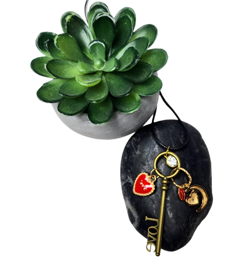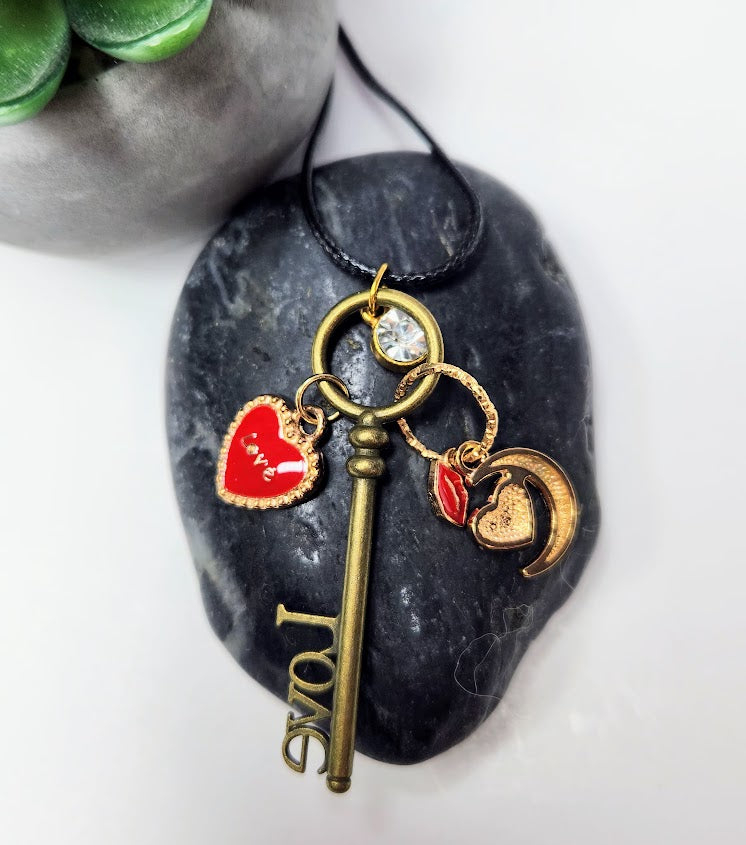 This handcrafted adjustable corded necklace features a charming assortment of love-themed pendants. The centerpiece is a vintage-style key inscribed with 'Love,' complemented by a sparkling gem and a red heart charm. Its adjustable design ensures a perfect fit for any wearer, making it an ideal accessory for expressing affection or adding a romantic touch to any outfit.