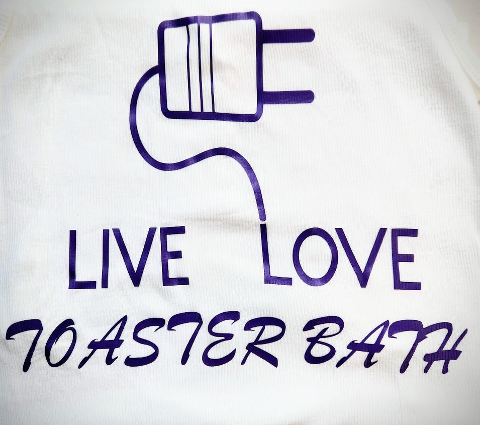 Express your quirky style with this large white tank top featuring a playful 'Live Love Toaster Bath' decal. The bold purple design adds a humorous touch, making it a standout piece for casual wear. Ideal for those who love unique, statement clothing. Ribbed texture, Stretchy.