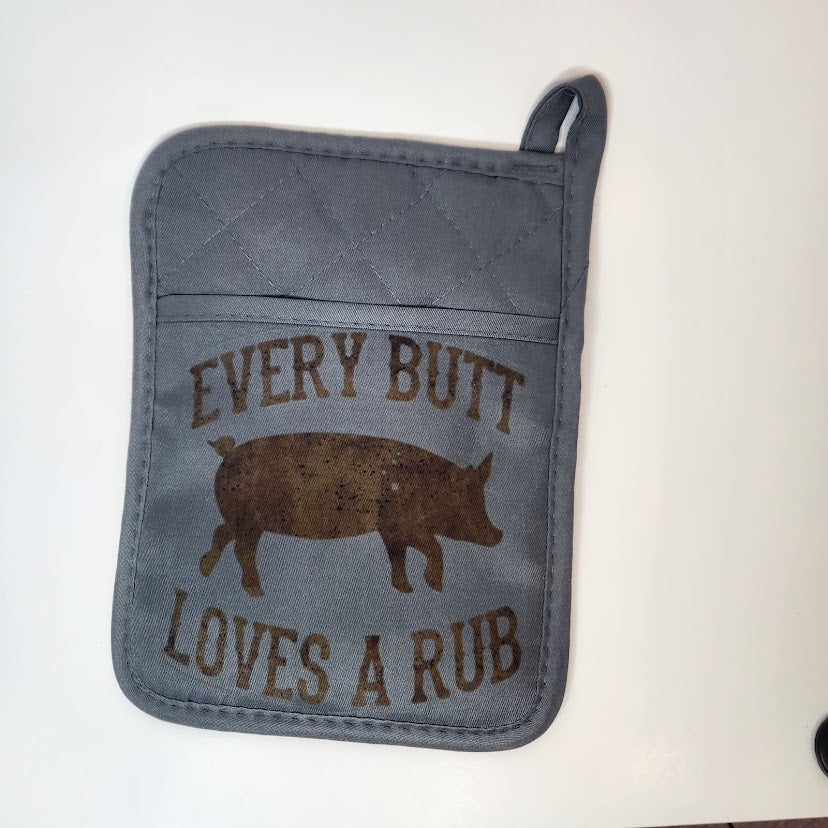 Protect your hands while adding flair to your BBQ space with our Rub Butt pot holder! Featuring a cloth front and non-slip rubber back, it makes a great gift for any BBQ master. Get yours now and elevate your BBQ game!