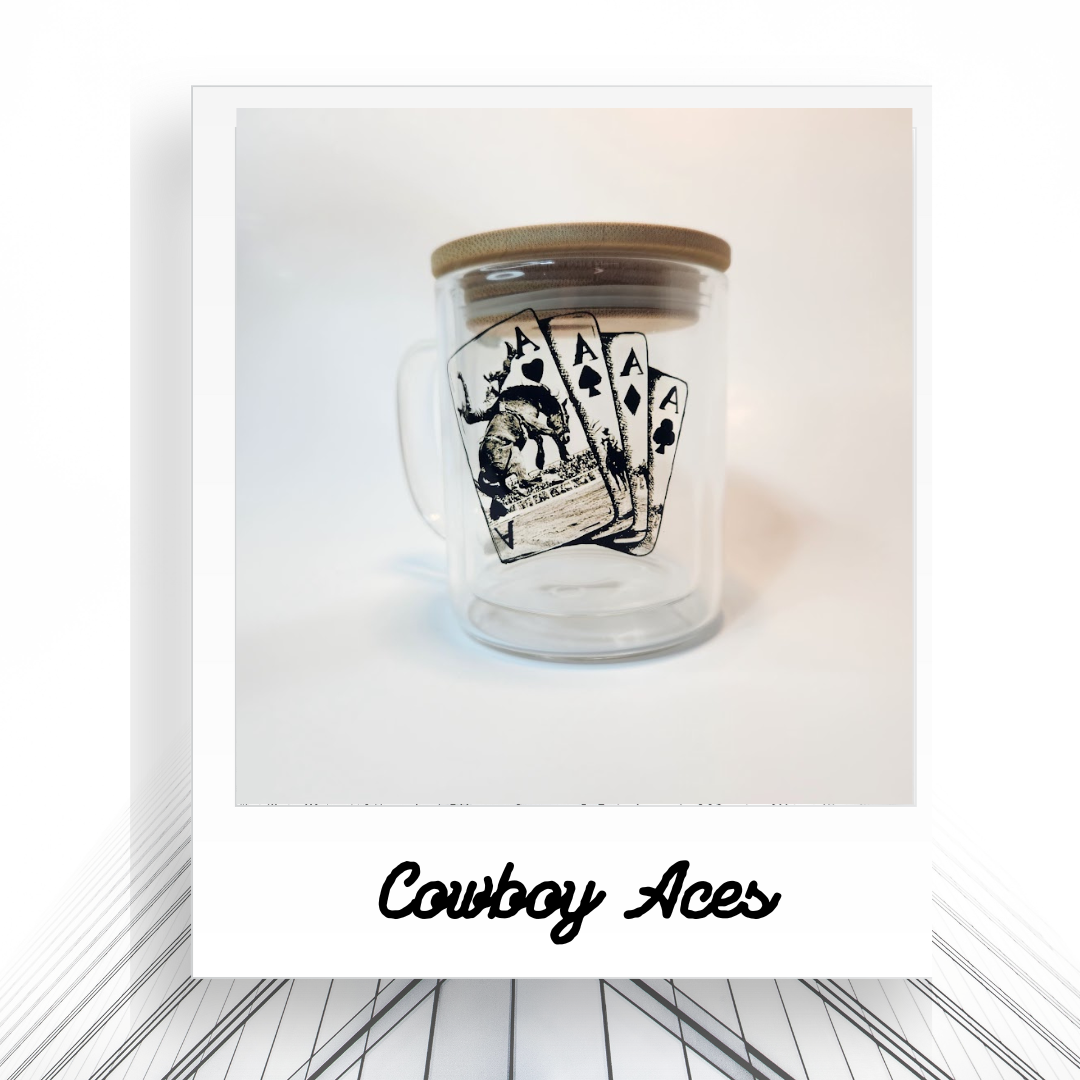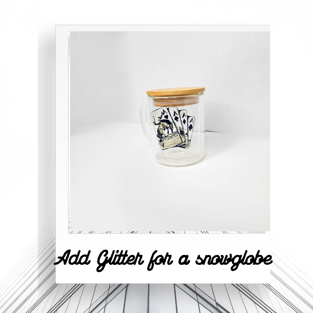 Saddle up with our RTS 9oz Cowboy Aces Glitter Globe Mug! Enjoy your favorite drink in style with this customizable mug featuring a cowboy aces design. Add your own touch with glitter or let us do it for you. Includes a bamboo lid and straw for easy sipping. Yee-haw!